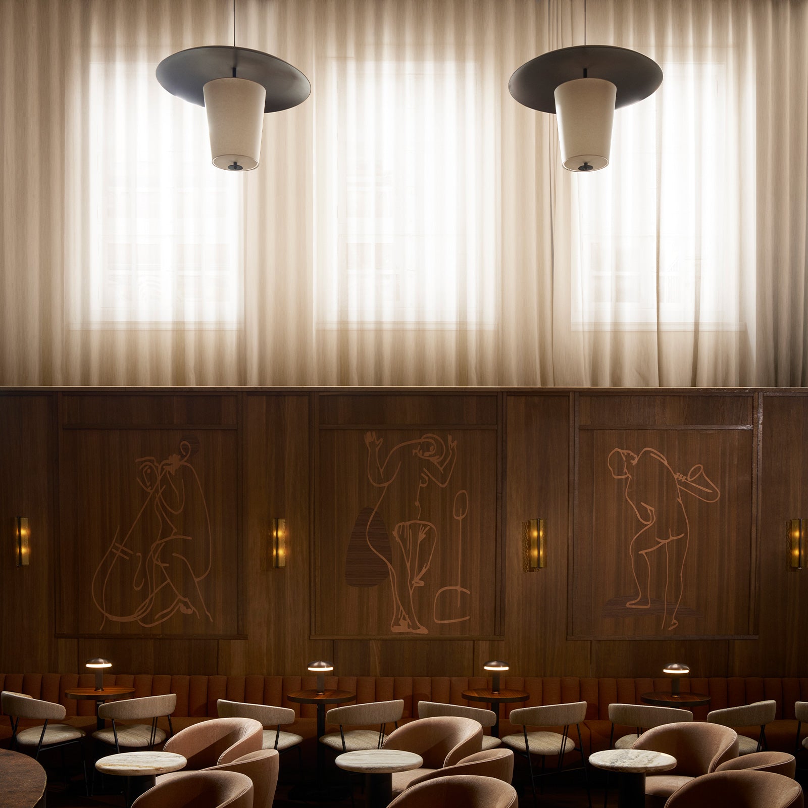 To shape the lightscape of Epicurus, GamFratesi collaborated with LYFA on three new designs: RYFF, TOTON, and NOOTE—each created specifically for the project and now part of LYFA’s permanent collection. RYFF, a wall lamp with sculpted glass, captures the movement and rhythm of music through its textured surface. TOTON, a large pendant, pairs a metal lens with a soft fabric diffuser to create a refined yet grounded atmosphere. NOOTE, a portable table lamp for the jazz club, blends 1930s elegance with contemporary clarity, offering a warm, intimate glow that enhances every note and conversation.