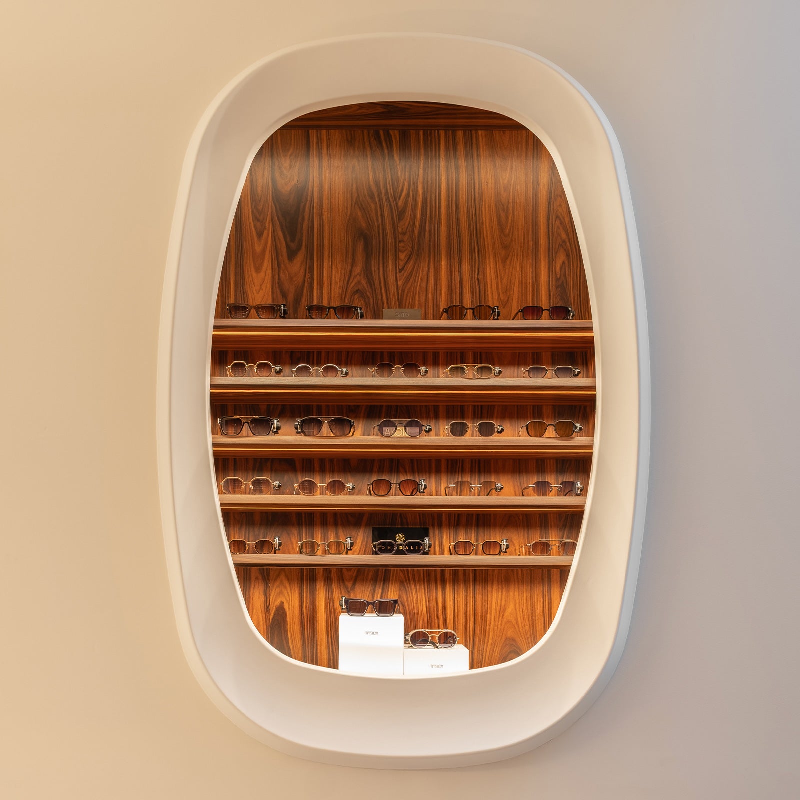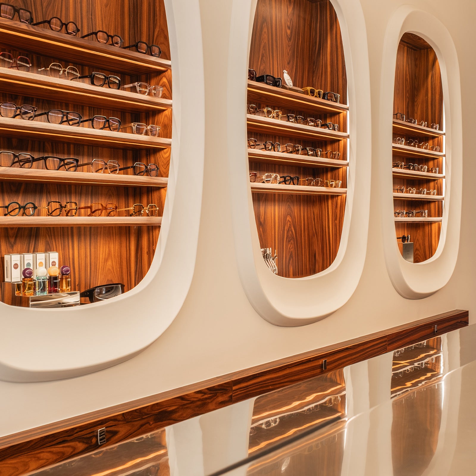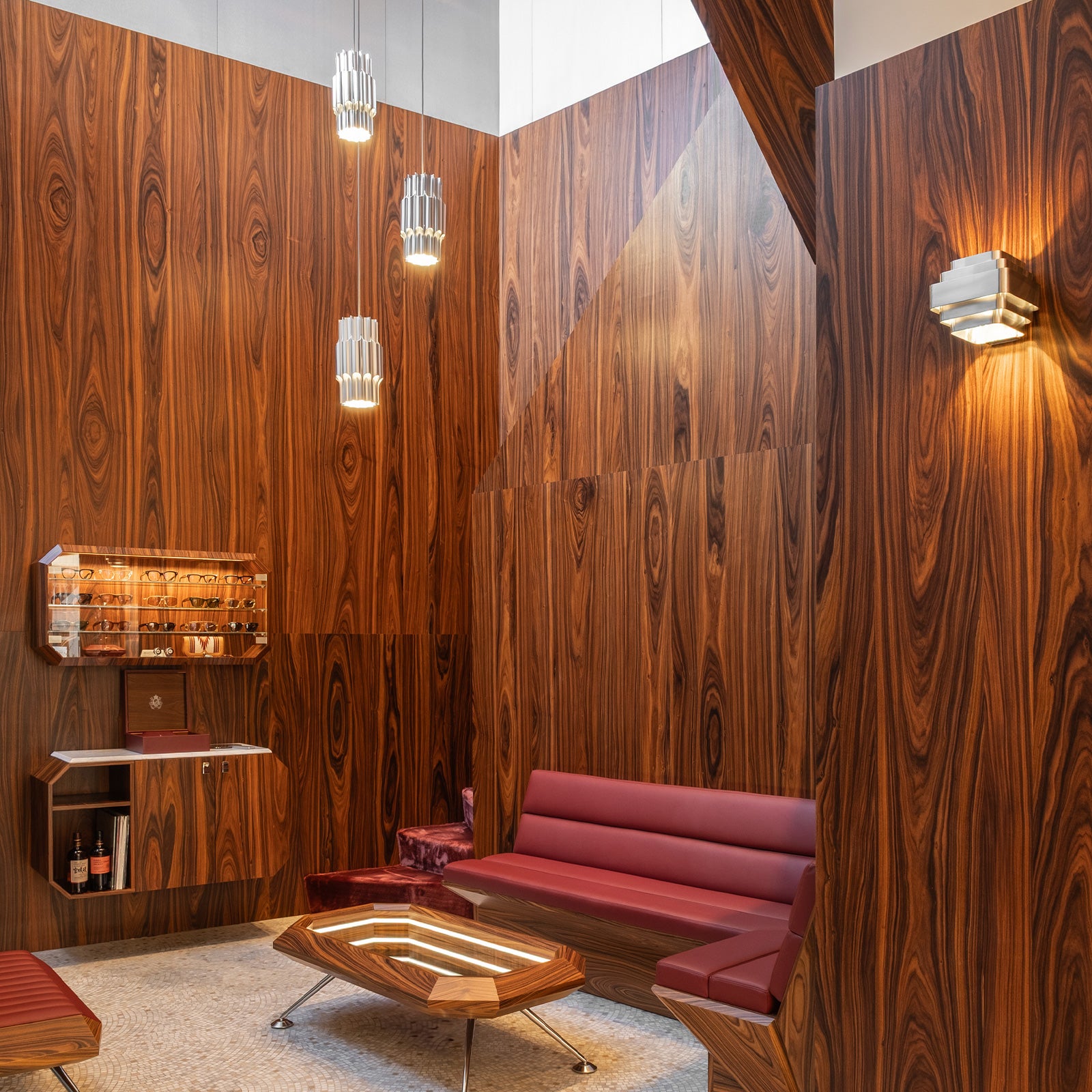 The brushed aluminium finish and geometric composition of the PAN Pendants echo the material palette of the interior, which blends rich natural stones with brass accents and velvet textiles in jewel tones. Together, these elements create a setting that celebrates craftsmanship, both in optical expertise and in design.