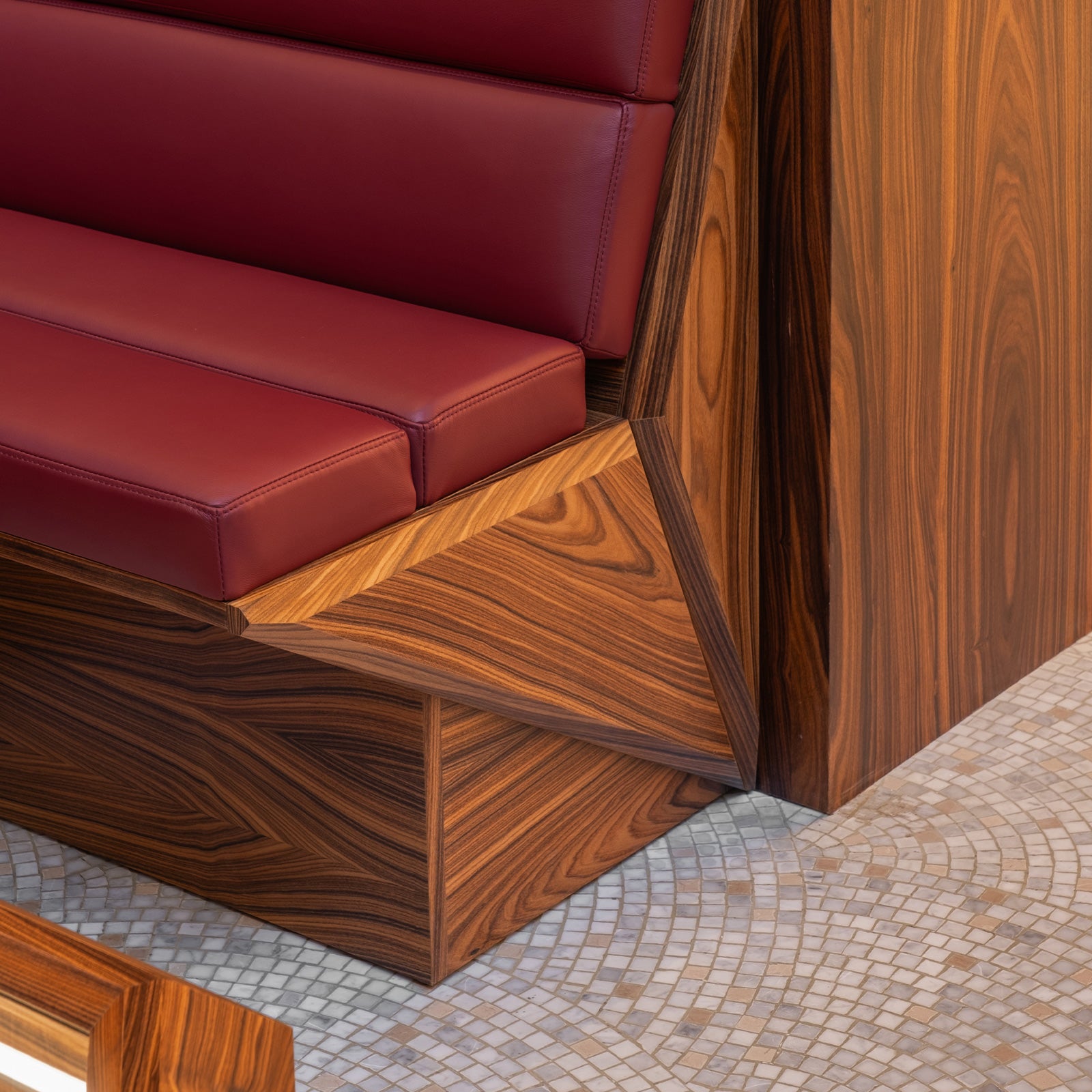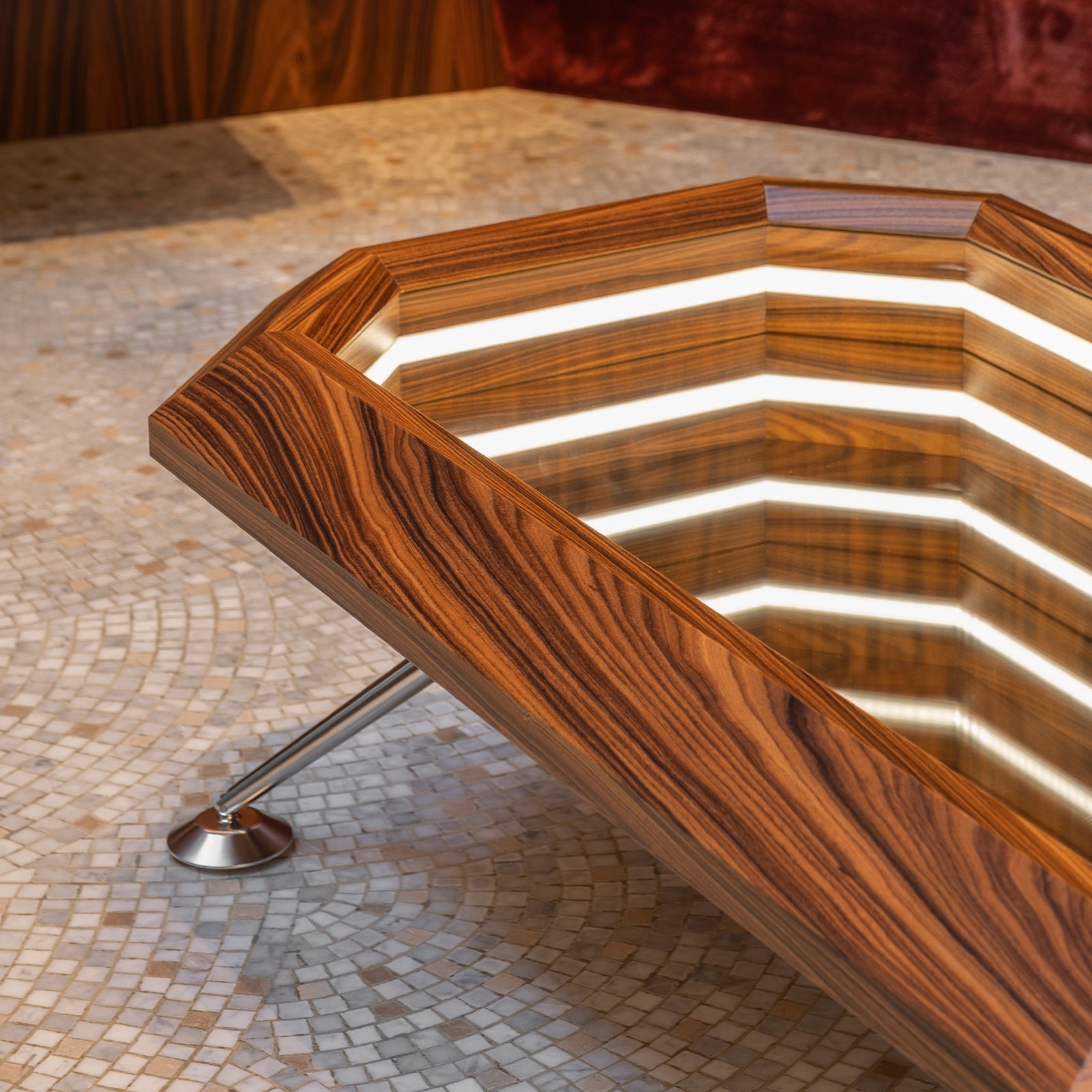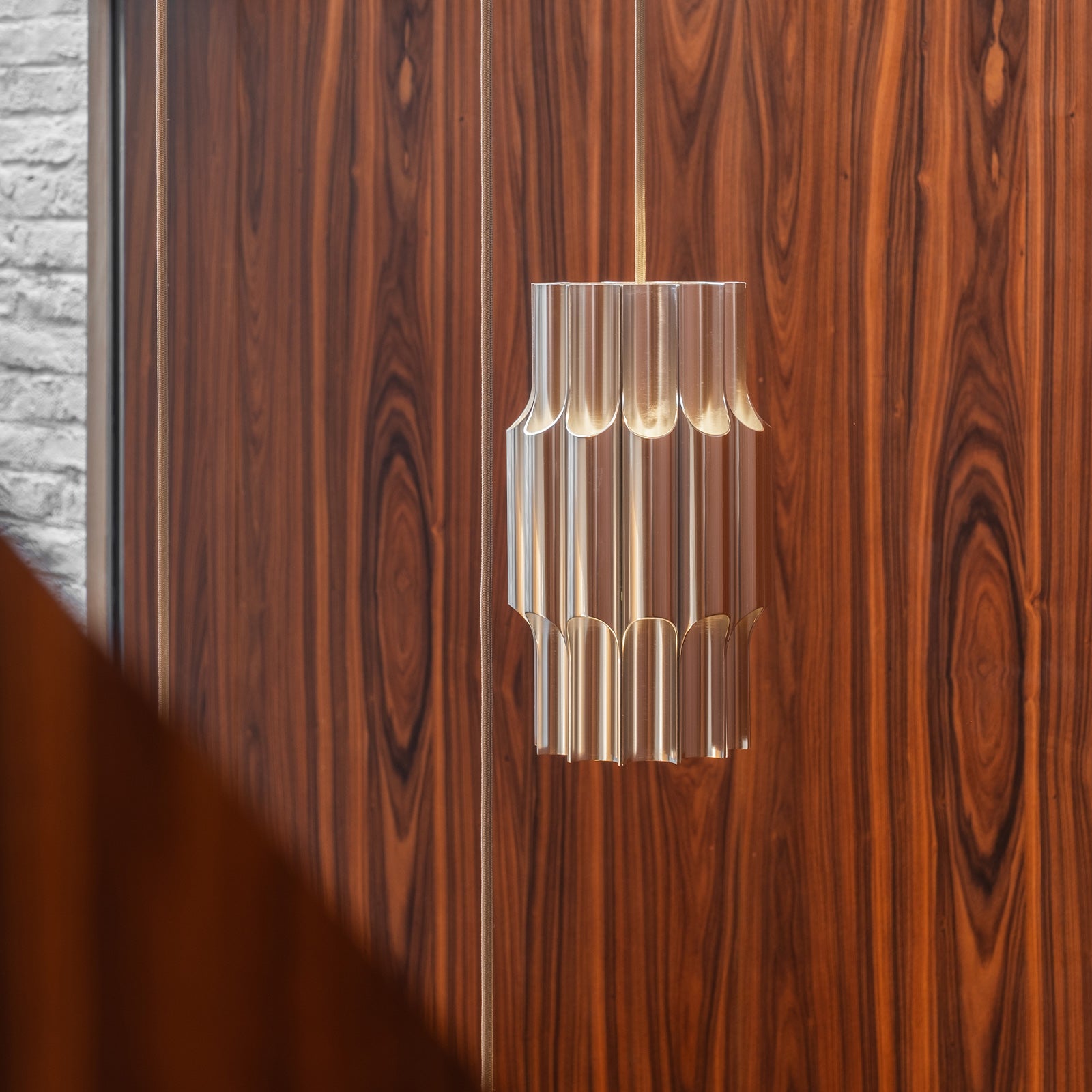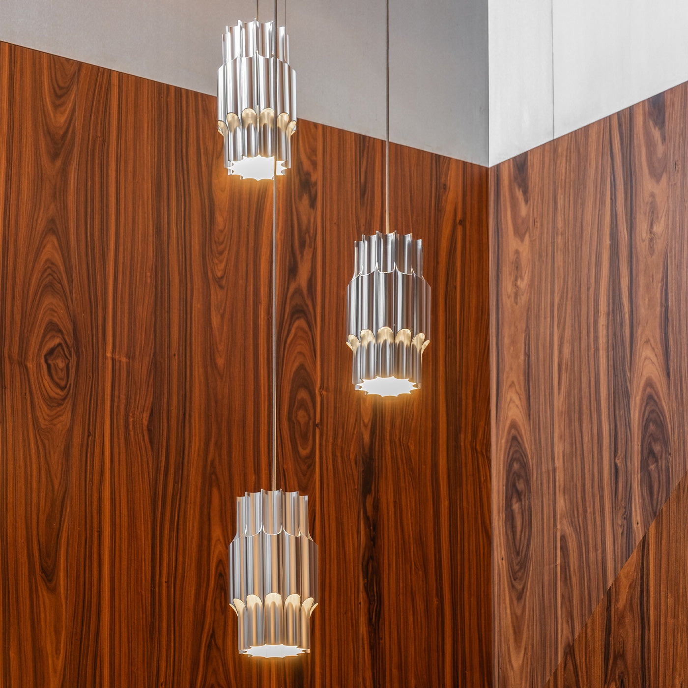 The brushed aluminium finish and geometric composition of the PAN Pendants echo the material palette of the interior, which blends rich natural stones with brass accents and velvet textiles in jewel tones. Together, these elements create a setting that celebrates craftsmanship, both in optical expertise and in design.