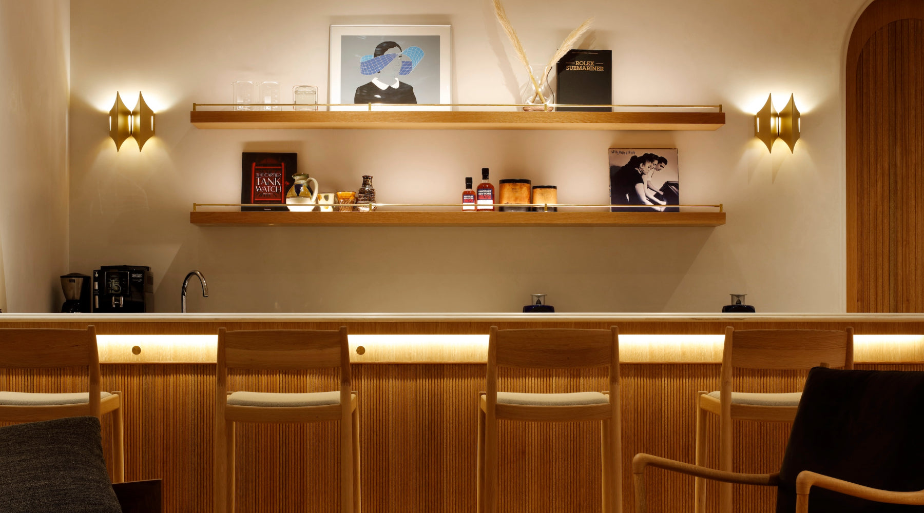 Two GOTHIC II wall lamps are beautifully placed behind the wooden counter inside the Tokyo-based Arbitro store. The two wall lamps’ dual shade fixtures emit a soft lighting that leaves a distinctive pattern on the wall while the brushed surfaces are subtly illuminated through the narrow peepholes. The warm hues and atmosphere inside the Arbitro store is an elegant fusion between stylish vintage, true craftsmanship and modern interior.