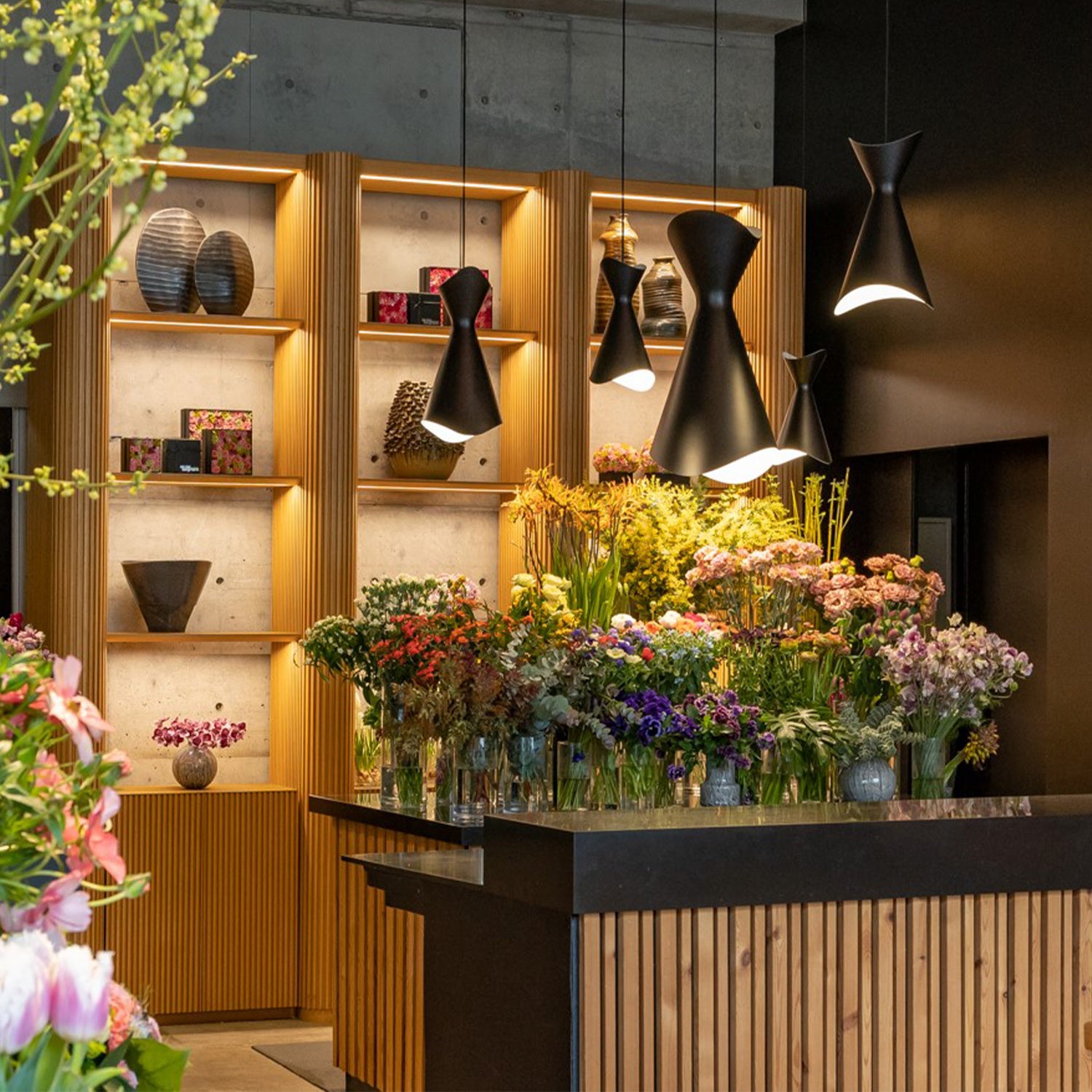 Danish flower artist Nicolai Bergmann’s Tokyo Flagship Store has recently undergone a complete interior renewal and officially reopened in January 2023. An abundance of natural light flows through the interiors with concrete-based ceilings and walls. At the same time, the numerous clouds of different-sized NINOTCHKA pendants make a stunning display and cast light on the oakwood flower tables, pedestals and counters, beautifully illuminating the space.