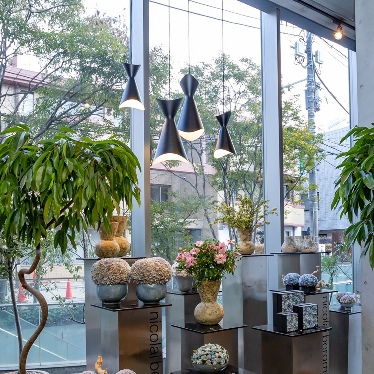 With its simple yet sophisticated interior design, the flower boutique Nicolai Bergmann Flowers & Design is always ready with a lineup of seasonal fresh flowers. Additionally, limited items, earth-coloured preserved flower objects and so on, only available at the flagship store, welcome visitors to a new style of flower design experience.