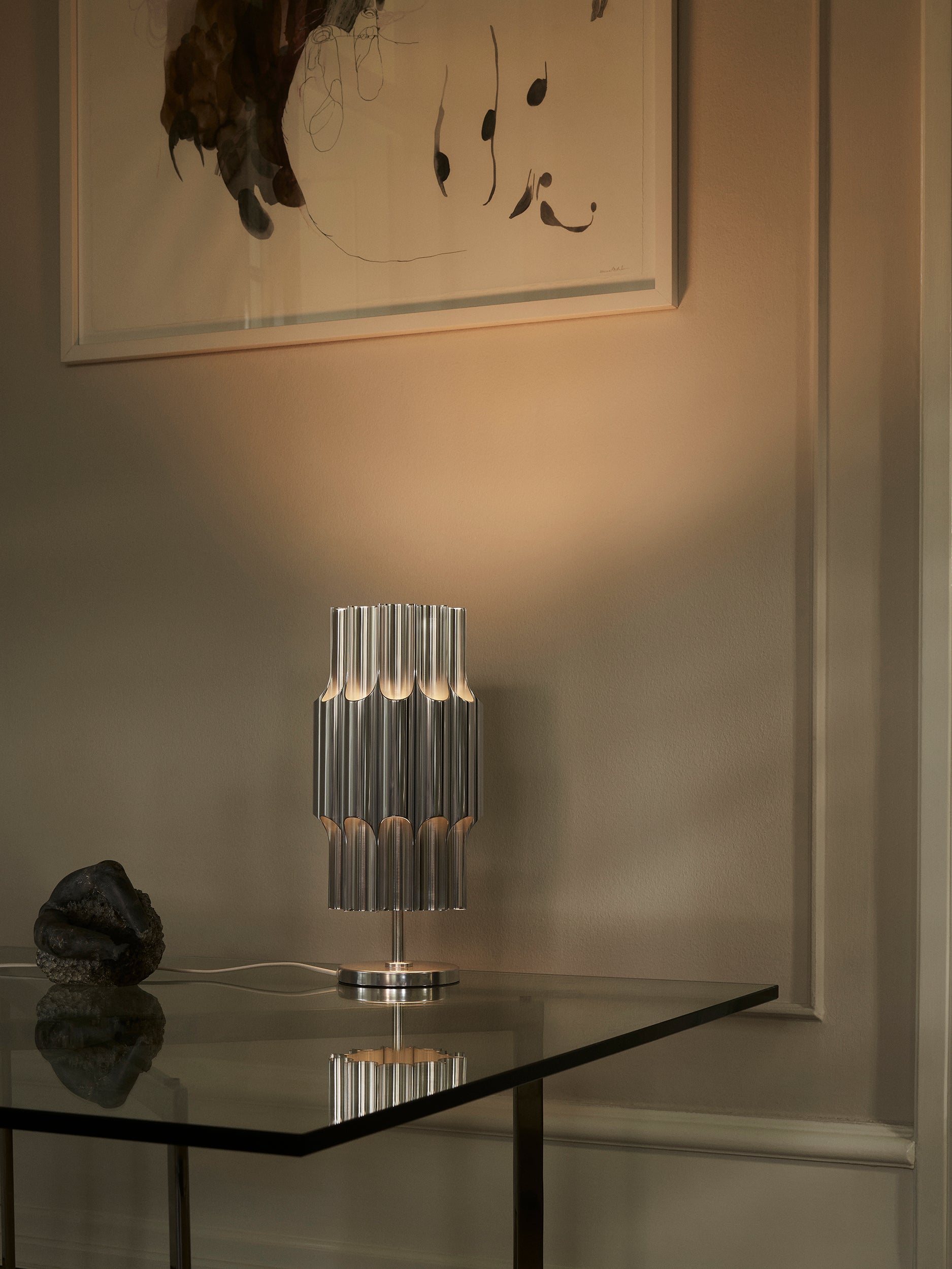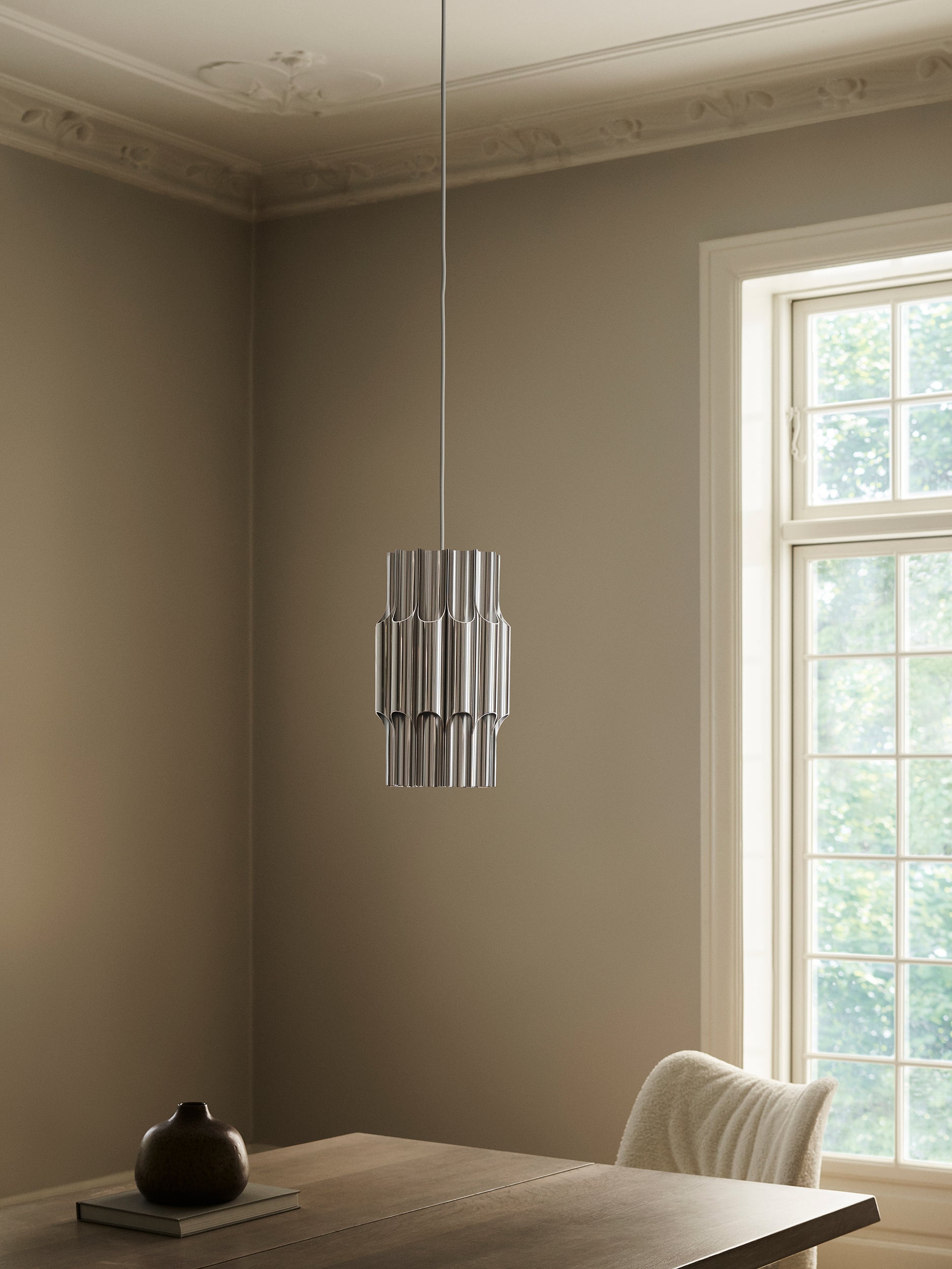 One part light and one part art, PAN is visually striking at all hours of the day. The iconic pendant is designed by Bent Karlby in 1970 and crafted from 12 polished aluminium pipes. While elegantly illuminating its glossy exteriors through its open pipes, the pendant provides comfortable downlight and subtle ambient lighting through its open top.