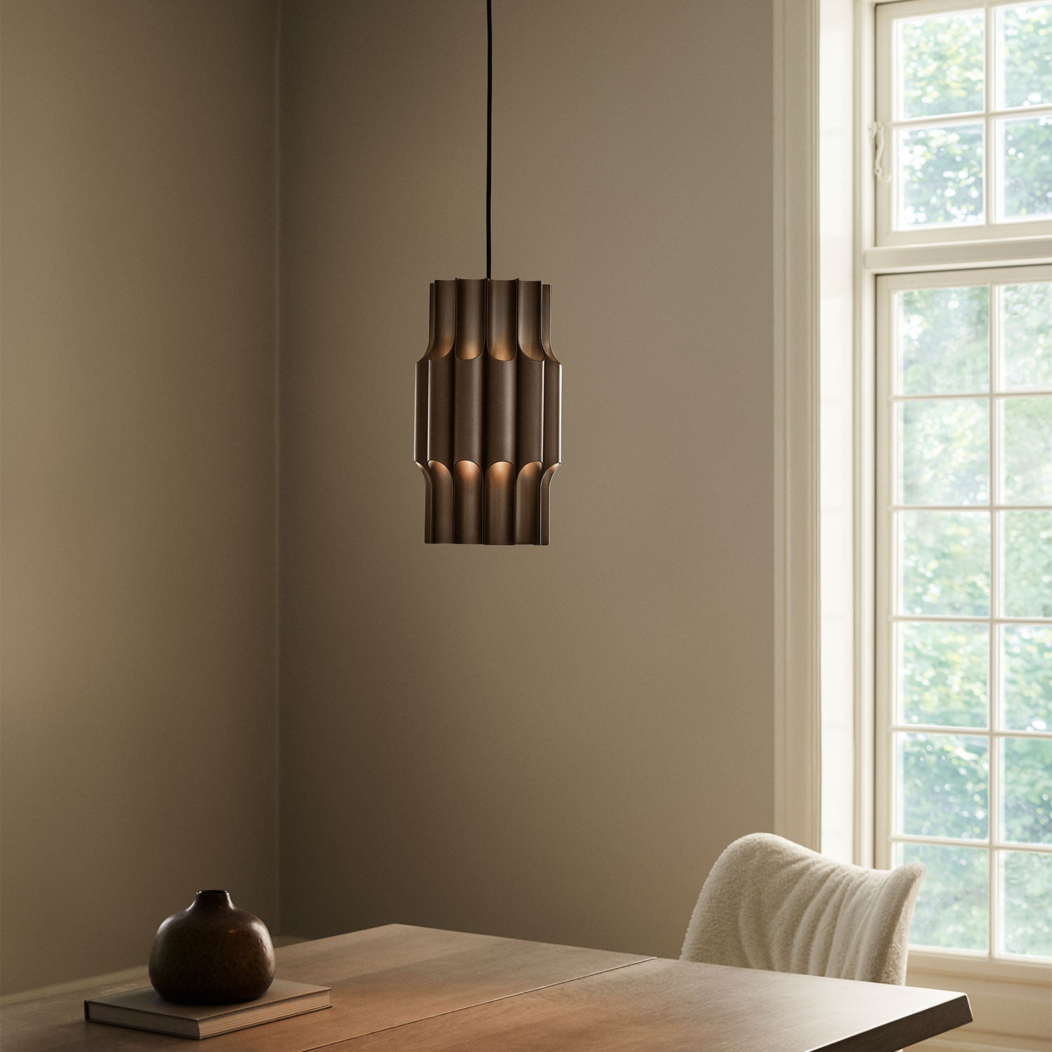 TOTON er inspireret af ideen om at forvandle musikalitet til lys og blande rytme, harmoni og tilstedeværelse i ét objekt. Som en dyb tone, der vibrerer gennem rummet, skaber denne store pendellampe en omsluttende og sofistikeret atmosfære. Dens form har en stor metallinse på toppen, der er designet til at sprede lyset jævnt og blødt nedad.