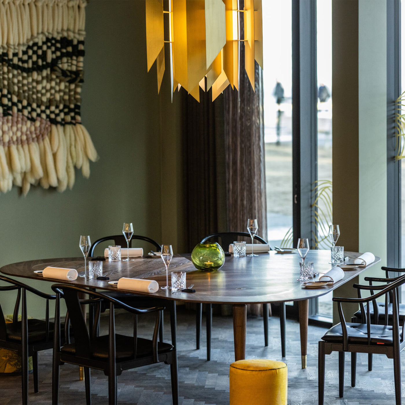 At the waterfront of Aarhus, rows of custom-made NINOTCHKA pendants form a wavy ceiling inside the newly opened restaurant, Ghrelin. The smoked wood and brass detailing match the watery green colour that fills the room. Along with the green NINOTCHKA pendants, a large DIVAN 2 700 Brass creates an intimate atmosphere above a wide dining table while GOTHIC wall lamps elegantly illuminate the staircase.