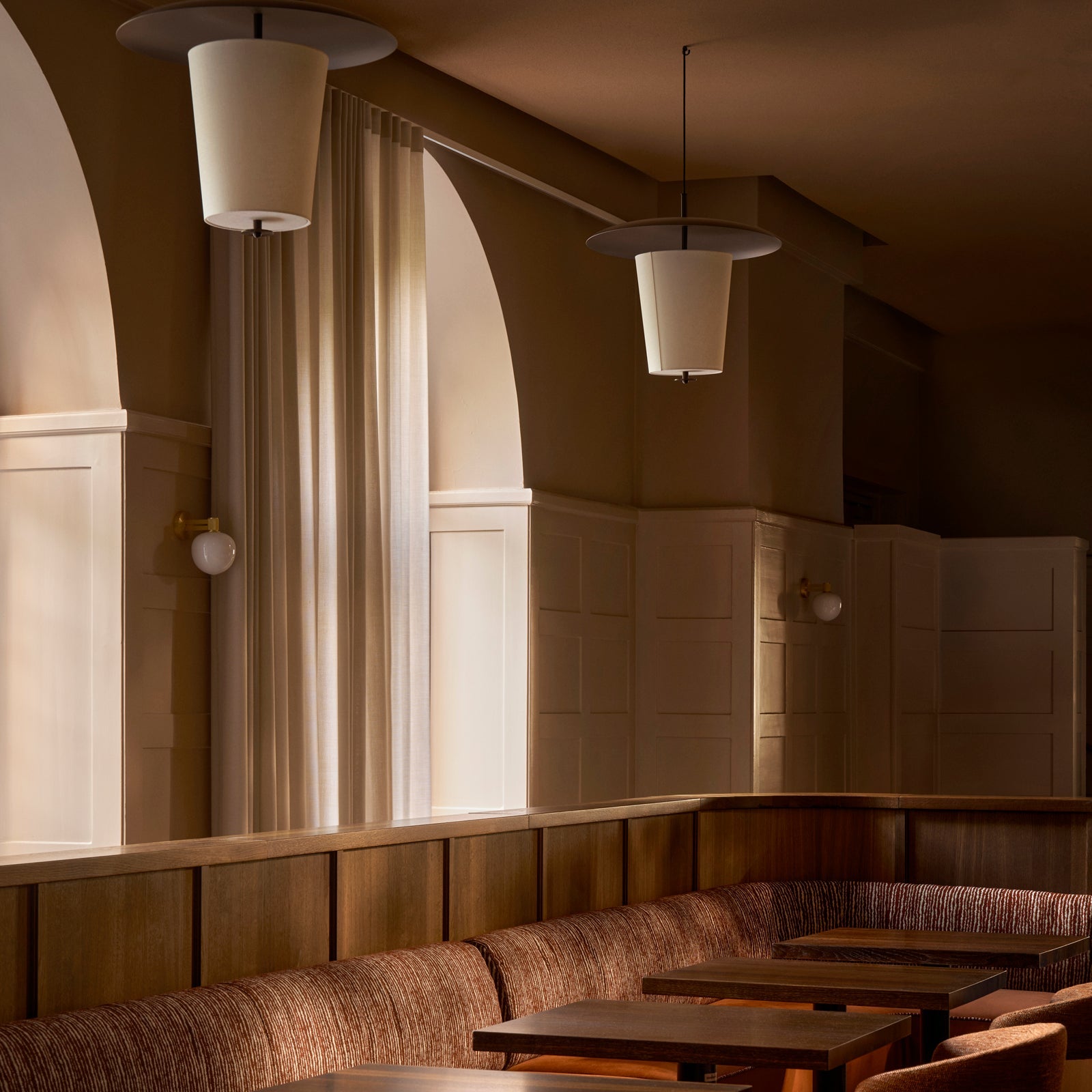 Its form features a large metal lens on top, designed to diffuse light evenly and softly downwards. Below, a fabric element adds warmth and texture, complemented by a refined bronze detail that completes the design with a touch of elegance. Toton is crafted for large spaces, where light becomes not just illumination but an element that defines the atmosphere with style and character.