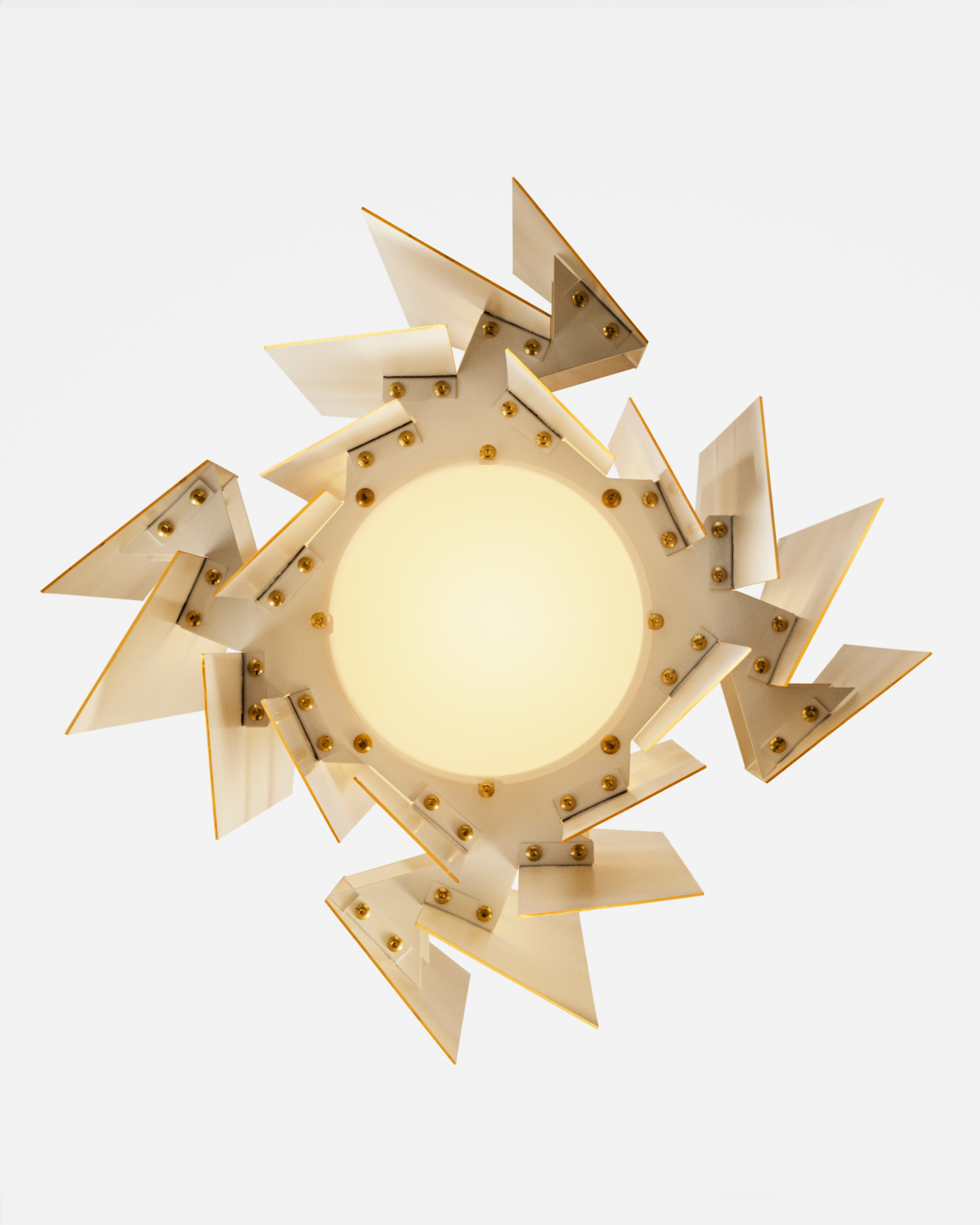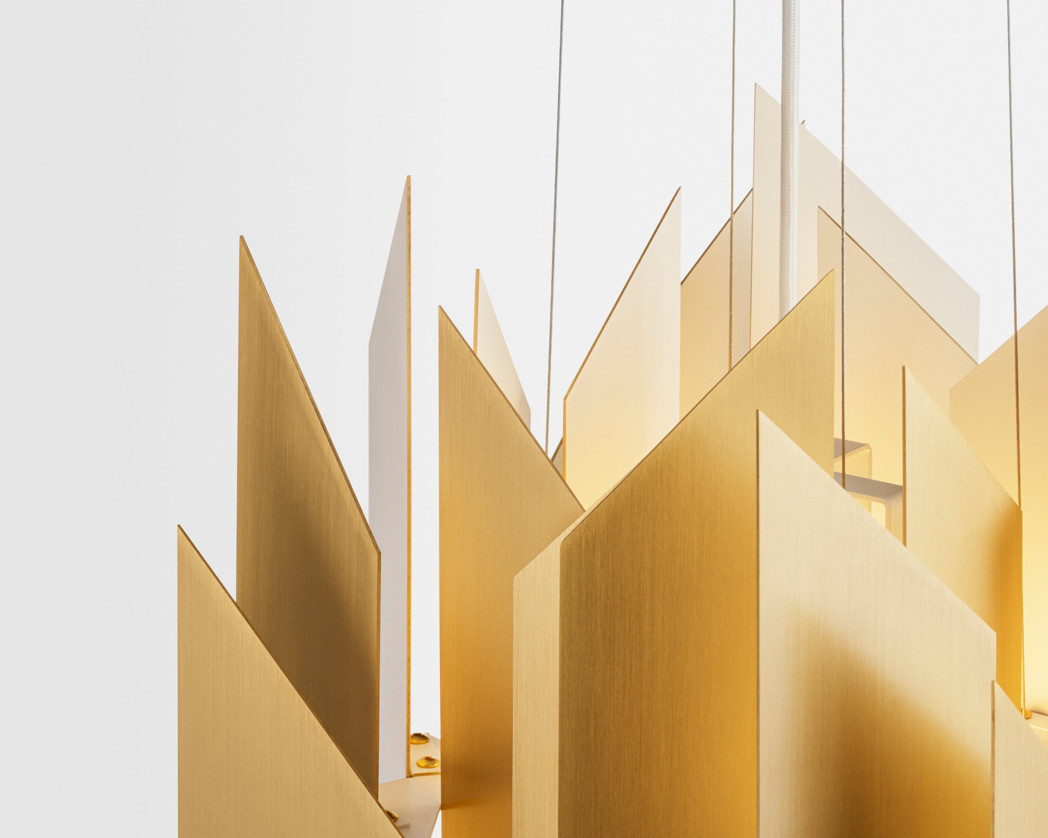 DIVAN 2 is a truly captivating pendant designed by Simon P. Henningsen in 1962, now updated in solid brass. The carefully positioned trapezoids provide soft and comfortable downlight while enacting a fascinating light display into the room. A sculptural piece of art, still hand-assembled to perfection. You can see the original polished stainless steel version with multicoloured trapezoids by following the link: DIVAN 2 Original
