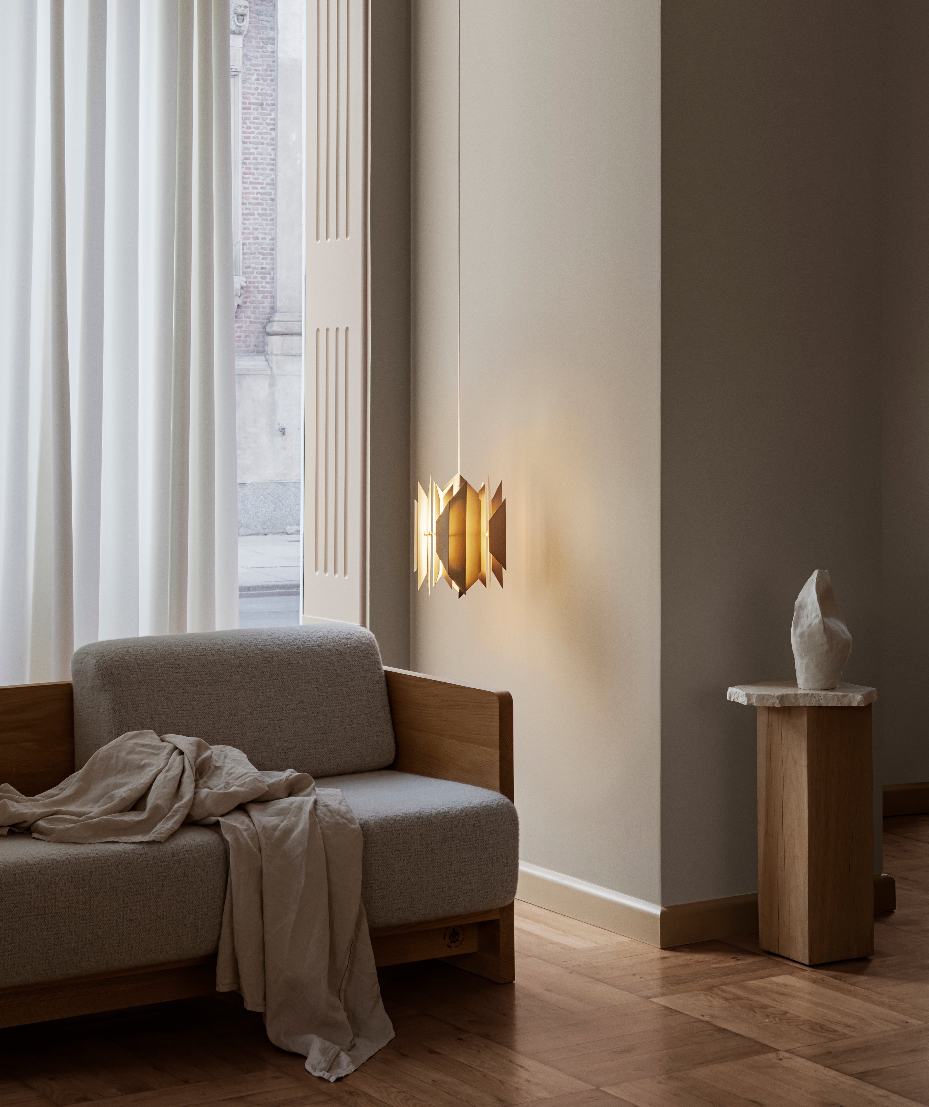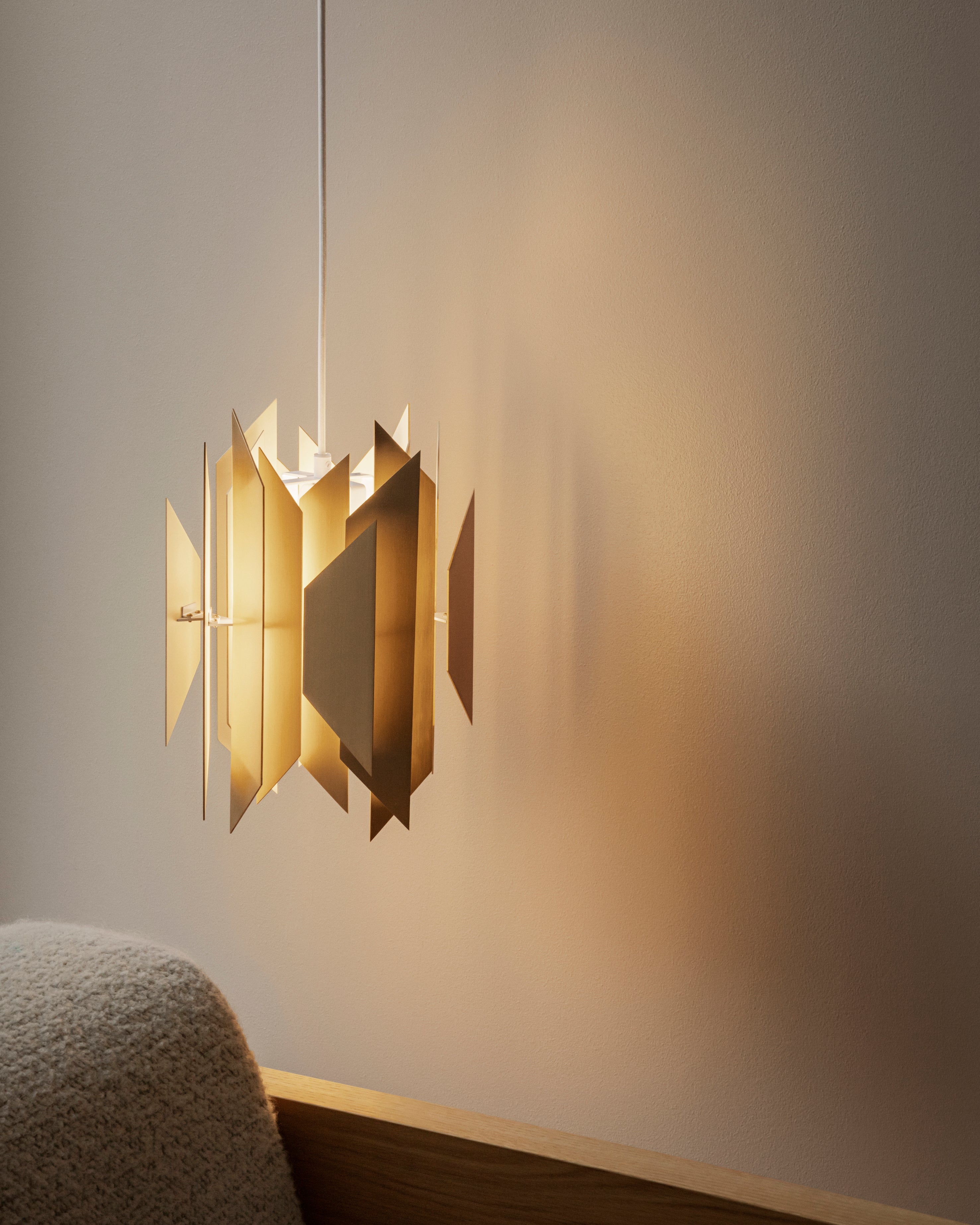 The new edition of the DIVAN 2 pendant in solid brass shimmers and glows without being flashy. Thanks to the carefully positioned trapezoids, the pendant provides a comfortable glare-free light while cascading indirect light into the room by reflecting the white surfaces on the inside and the brass surfaces on the outside.