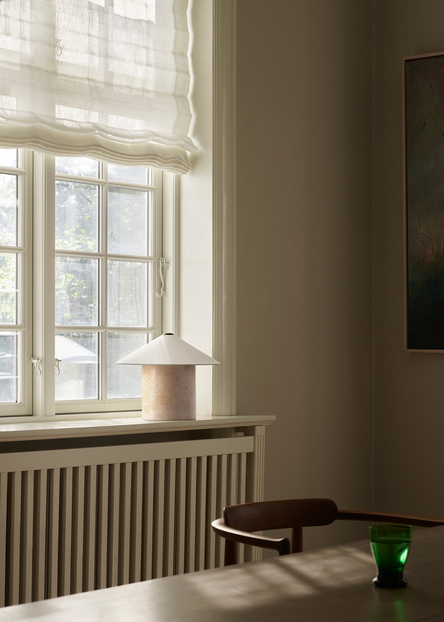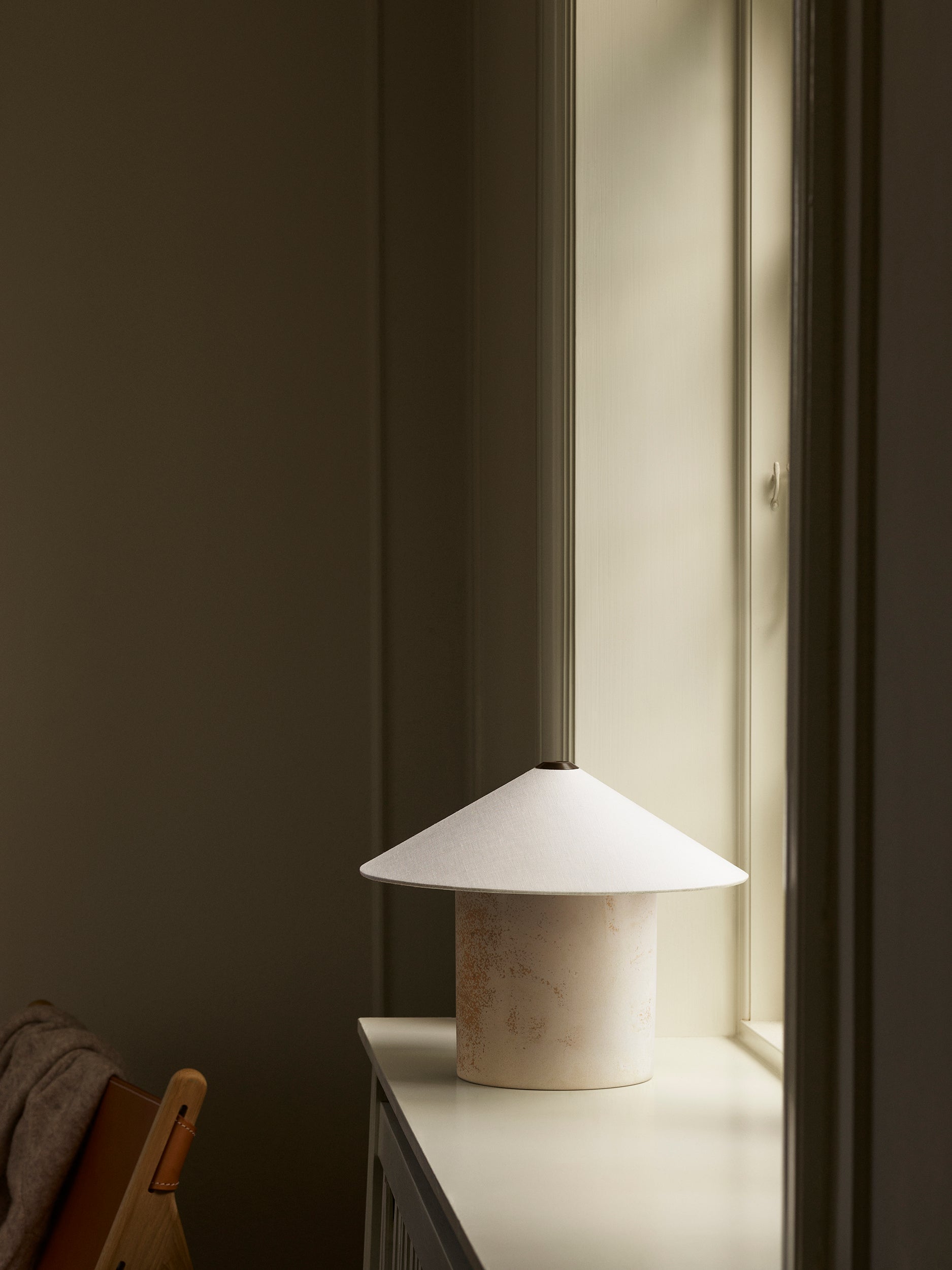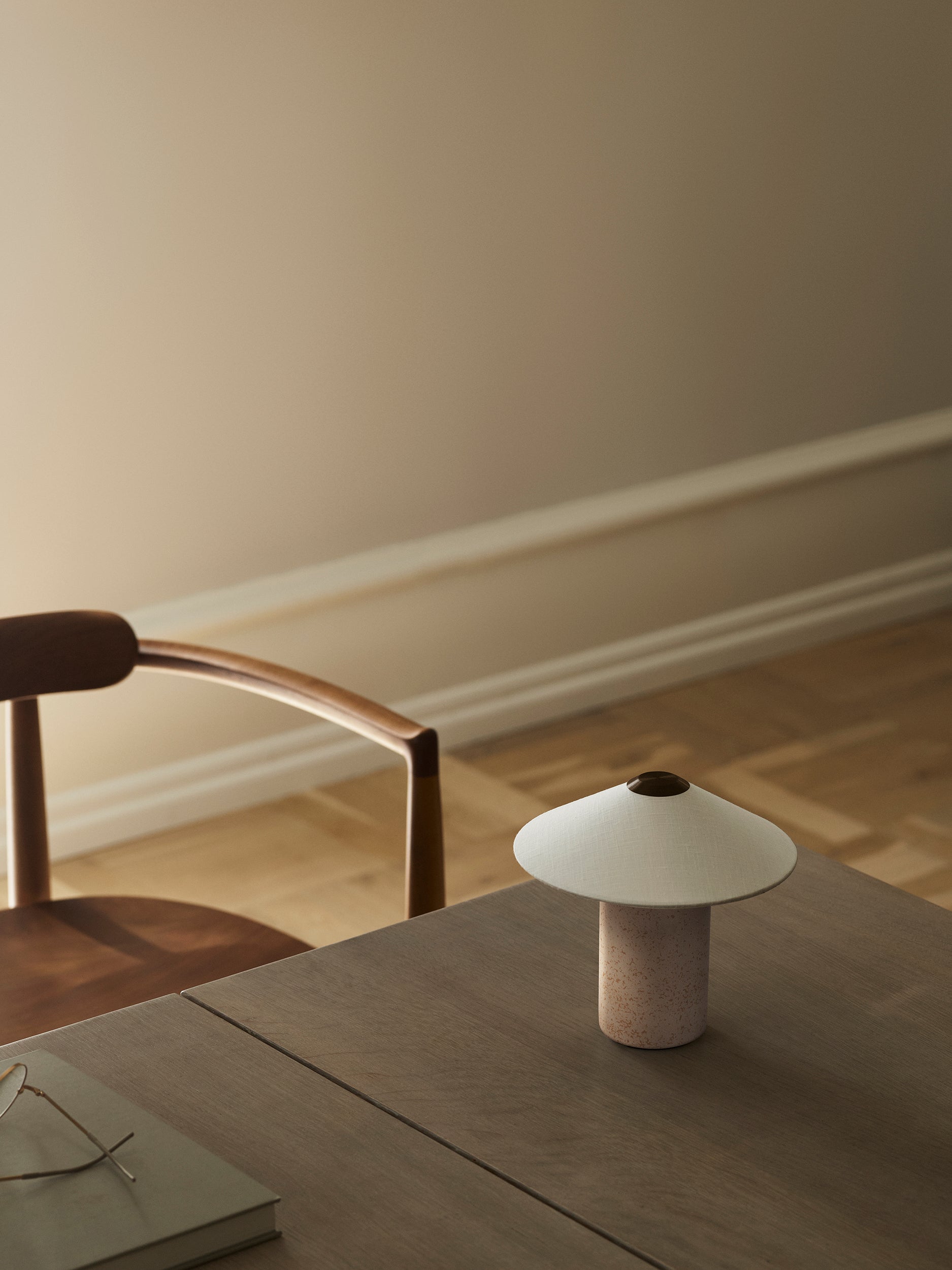 The FUTÉ lamp, with its soft textile shade, gently diffuses light, spreading a warm and inviting glow throughout the room. Designed to create a welcoming atmosphere, this delicate diffusion of light adds a touch of elegance, perfect for creating an ambient setting.