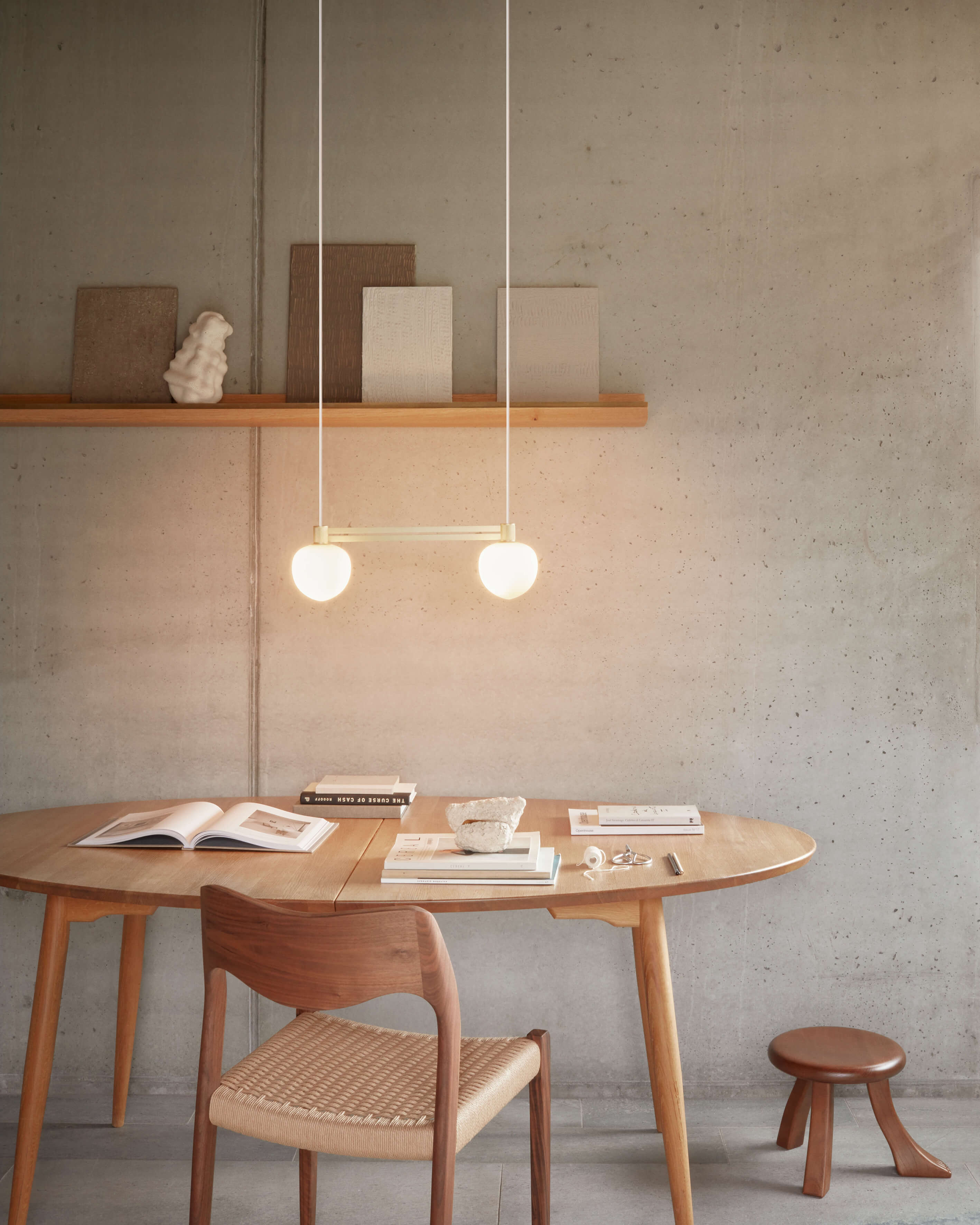 GamFratesi has designed the MEMOIR series with vivid contrasts in mind. The opal glass shade is shaped gently with a significant tip at the bottom that evokes certain historical elements and styles of the past. In contrast, the metal suspension and linear connectors are modern and graphic elements. MEMOIR is designed to bring compositions of luminous sculptures to life for both domestic and hospitality spaces.