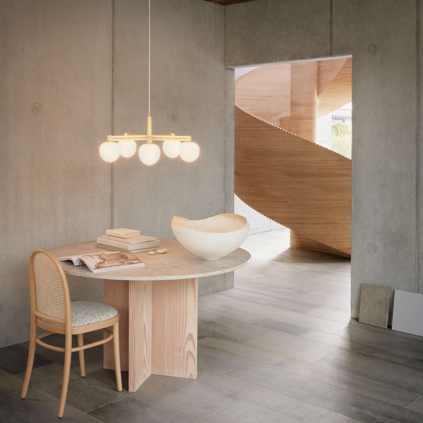 MEMOIR is a product family designed by GamFratesi based on a modern take and interpretation of the classic chandelier. At the heart of the design is the gently shaped opal glass shade that evokes a historical typology and romantic spirit. The linear metal structures compose a graphic outline that allows it to be connected in numerous compositions. The simplistic ingenuity of the MEMOIR lighting system bridges decorative details of the past and a sculptural silhouette intended for modern spaces.