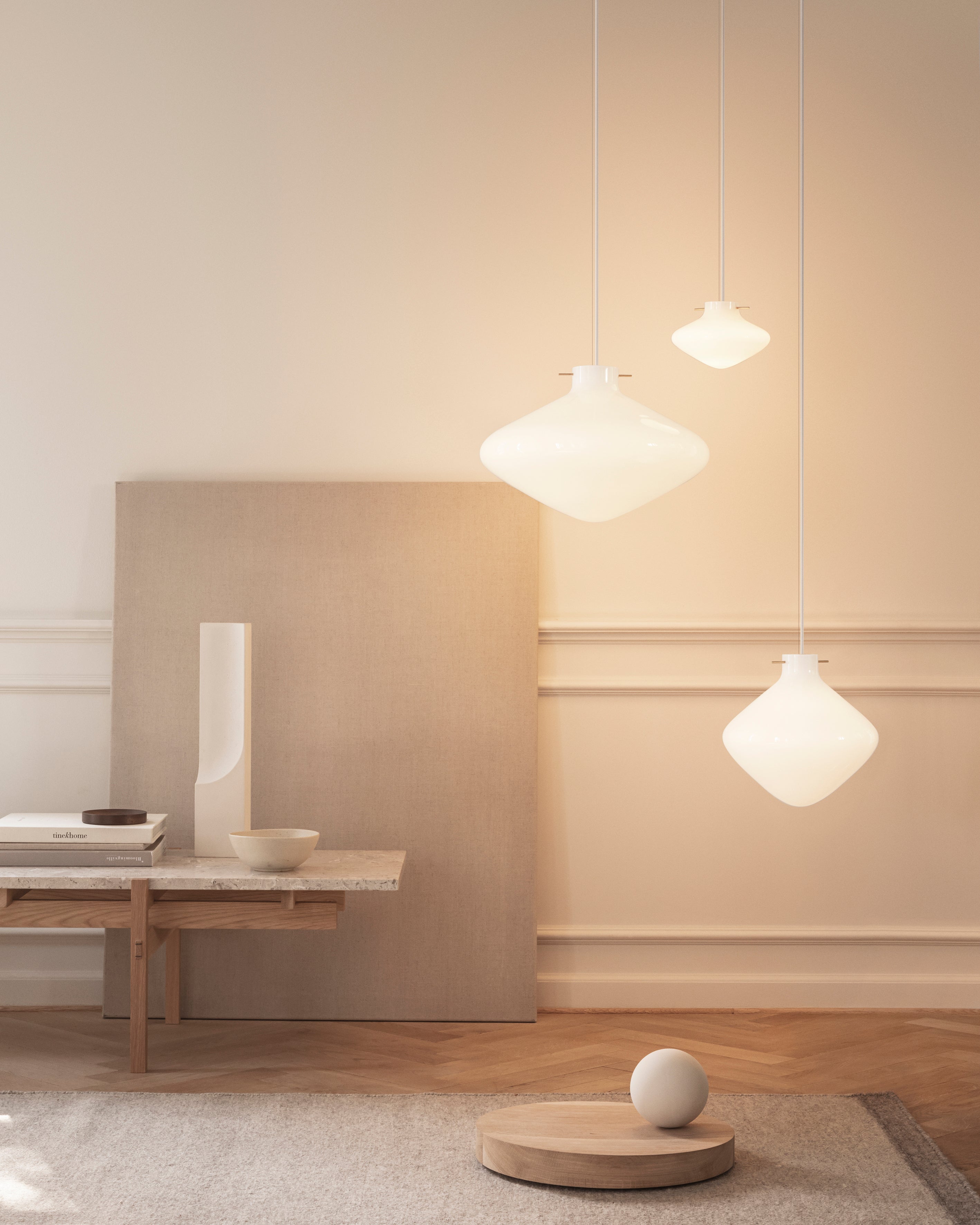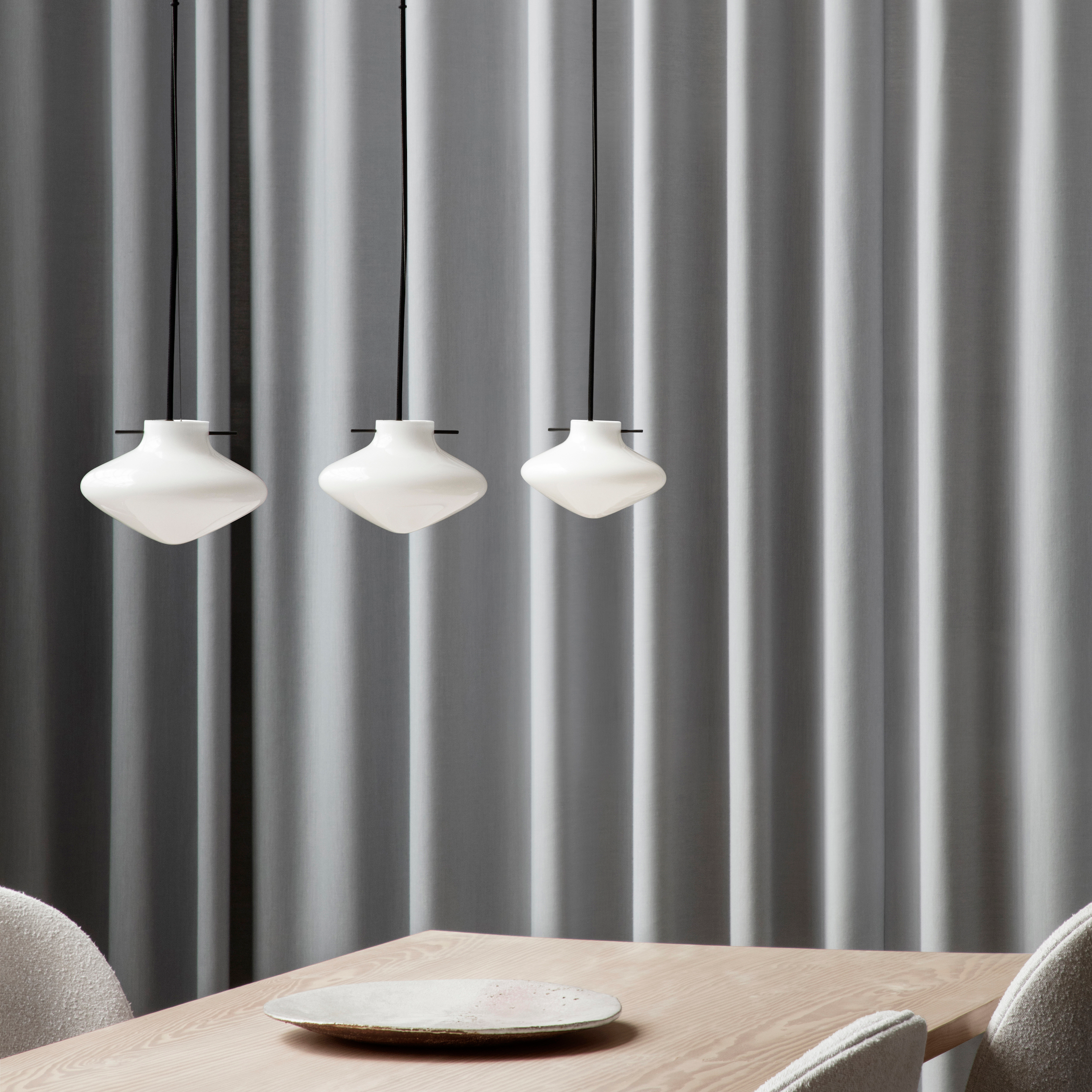 With its geometric interplay between the organic shapes and the straight line passing through the shade, the REPOSE series is designed to bring serenity of mind. The simplicity and functionality of traditional Japanese hair pins provided a spark of inspiration for the design. Focusing on the balance point that creates a serene and suspended feeling of balance while giving great importance to the smallest detail of the lamp. The striking purity of the stick provides a lightweight appearance to the large, opal glass shades, which make the pendants almost floating in the air – evoking meditative movements of hanging mobiles that are formed between object and space. With its calm and contemporary expression, REPOSE is intended to ease your mind and illuminate living spaces.